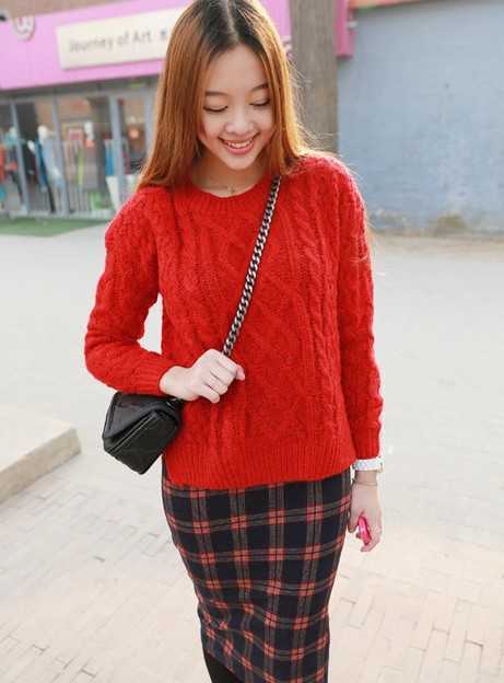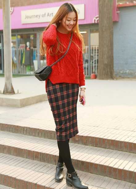 喜气的新年红,时尚个性的菱格毛衣,瞬间让单调沉闷的冬日亮起来,搭配英伦格子裙,穿出淑女优雅气质,搭配黑色酷气短靴和小香风黑色小包包,散发出迷人气质,穿出一抹亮色的新年红冬装。