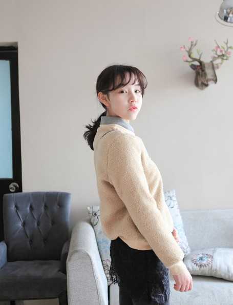 侧面看米黄色羊羔毛套头卫衣,溢满了温暖感十足,冬日穿起不再惧怕寒冷。