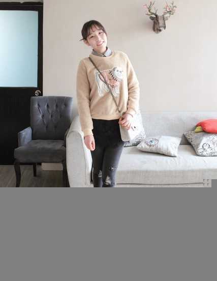 温暖十足的羊羔毛,可爱的狗狗印花套头卫衣,穿出温暖时尚感十足,内搭立体领子打底衫,轻松穿出时尚冬装,下身搭配潮气的破洞紧身牛仔裤,尽展优雅时尚范儿。