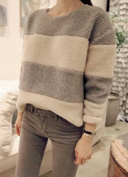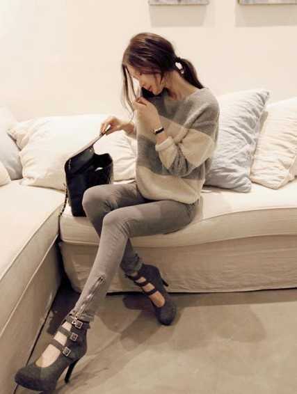 灰白独特的拼色设计,温暖的羊羔毛,穿出优雅大气范儿,搭配低调浅灰色紧身裤,凸显出完美无瑕的修长腿形曲线,随意搭配超显高显瘦的黑色高跟鞋,尽展时尚独特的冬日装扮。