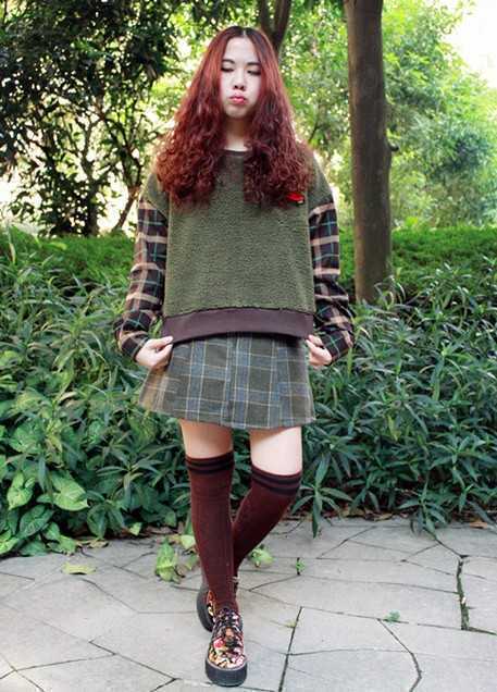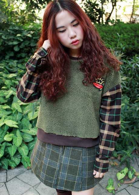 干练独特的军绿色拼色卫衣,个性的个性袖子拼接,展现出时尚触感,搭配格子小短裙和复古显瘦过膝袜子, 穿出时尚复古冬装,让你冬日靓丽出街。