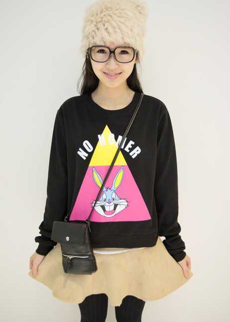 超二的大笑兔子印花,百搭黑色套头卫衣,时尚又百搭。