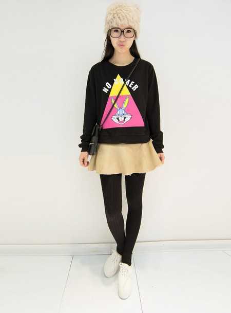 毛绒绒的柔软面料,百搭的卡通印花卫衣,搭配米黄色小短裙,搭配显瘦黑色打底裤,凸显出纤细完美的腿形曲线,随意搭配白色鞋子,轻松穿出潮气十足的冬装。