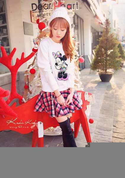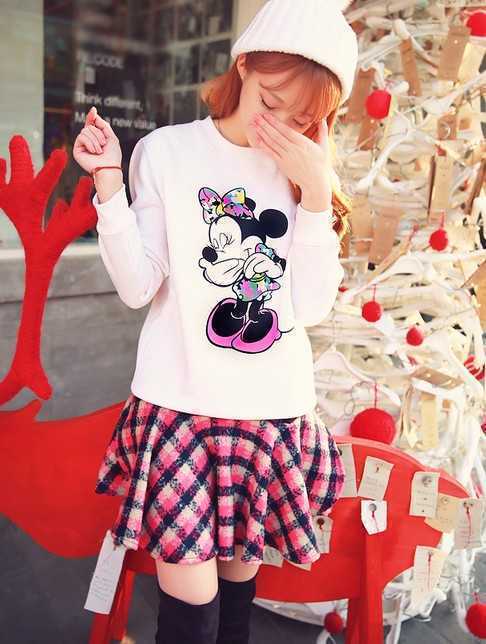 纯白色的米奇卡通印花卫衣,搭配英伦风的米黄色短裙,穿出粉嫩清新的冬装,下身搭配超显瘦显高的过膝长靴,秀出纤细完美腿形,尽展清新小女人气质。