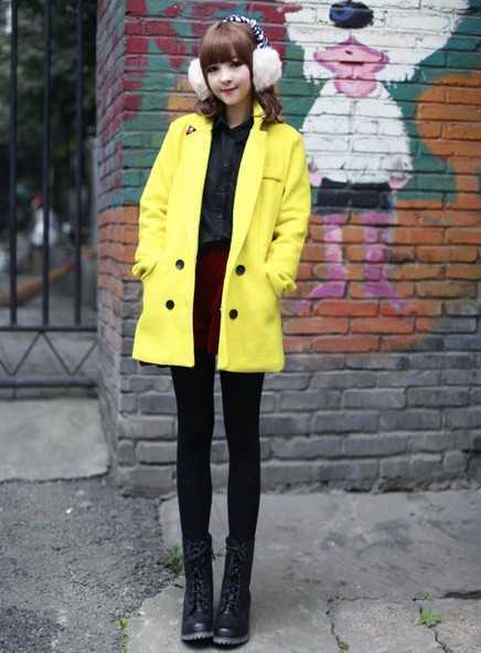 抢眼清新的嫩黄色毛呢外套,搭配酒红色短裤,清新又时尚,搭配超有型的黑色短靴,轻松穿出冬日韩范十足的清新LOOK!