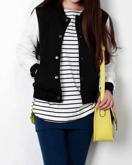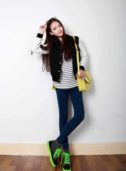 简约的韩版黑白棒球服,内搭百搭条纹打底衫,穿出百搭时尚的冬装,搭配亮眼潮气的荧光绿鞋子,尽展街头潮人装扮。