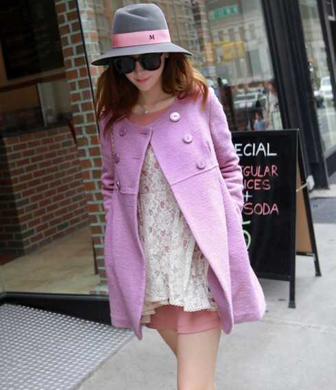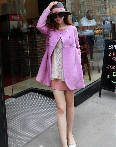 经典时尚的双排扣,简约迷离的兰花紫毛呢厚外套,随意搭配浅色系连衣裙,轻松穿出粉嫩乖巧时尚装扮。