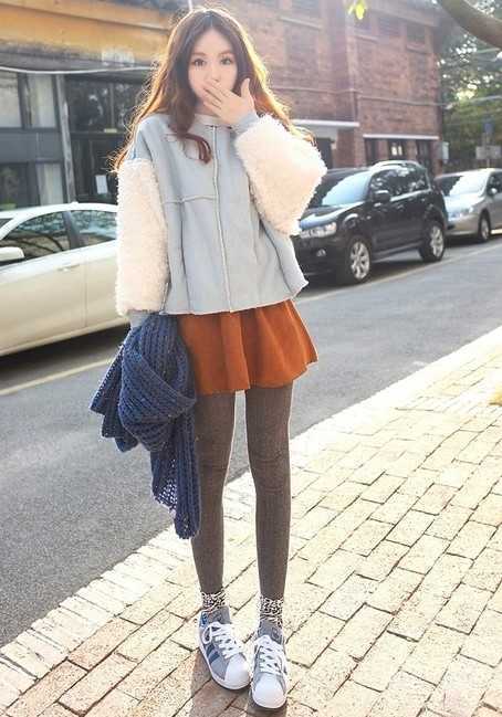 复古棕色高腰短裙,搭配显瘦咖啡色裤袜,秀出高挑纤细身形,随意外搭厚实粉蓝色厚外套,让你冬日温暖又时尚,小个子MM也能完美hold住!