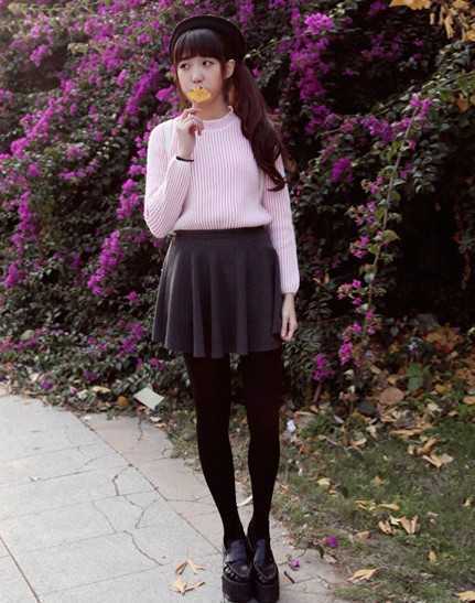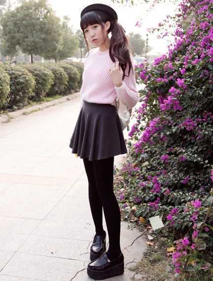 百褶显高的深灰色高腰短裙,搭配百搭经典的黑色裤袜,尽展高挑完美身姿,上衣搭配粉嫩温暖的毛衣,穿出粉嫩时尚装扮,让小个子MM也能完美展现出高挑身形。