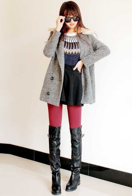 毛呢面料黑色小伞裙,搭配时尚的印花毛衣,穿出超显高有气质冬装 ,随意搭配黑色过膝长靴,让你冬日酷气时尚出行。