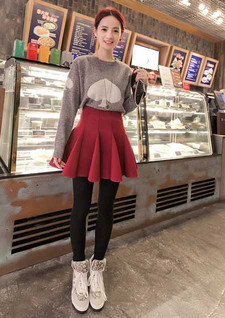 高腰复古红色小伞裙,搭配时尚心形毛衣,超显高显气质,尽展婀娜多姿身材,随意搭配时尚白色鞋子,让你冬日美丽动人出街。