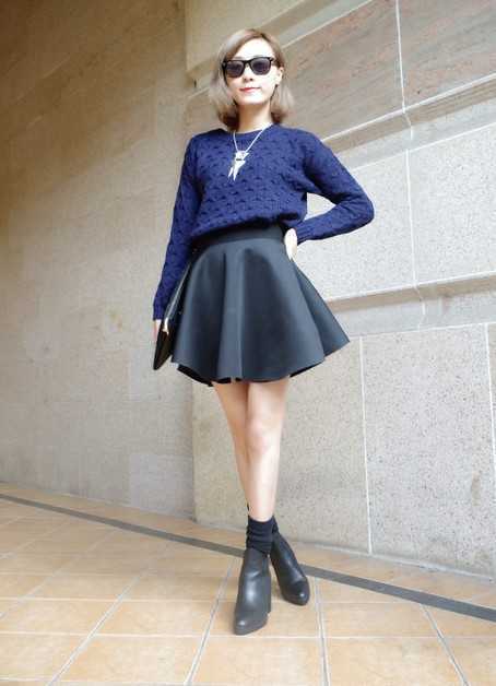 超显高显瘦的黑色复古小伞裙,搭配藏蓝色时尚毛衣,秀出高挑完美身形,搭配酷气黑色短靴,让你冬日穿着有气质。