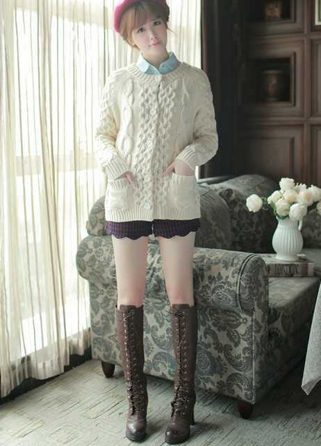 白色的恬静麻花毛衣,内搭浅蓝色衬衫,散发出恬静乖乖女气质,轻松帮你减龄,下身搭配复古短裤和超显高显瘦过膝长靴,穿出恬静学院风范儿。