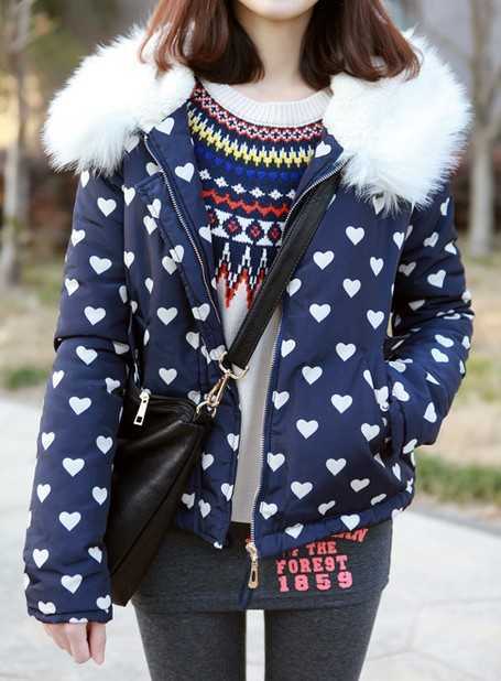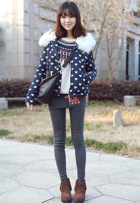 蓝色小清新短款棉衣,搭配显瘦的灰色打底裙,让你穿出冬日养眼装扮,时尚感的棕色流苏短靴,尽展小清新乖乖女形象。