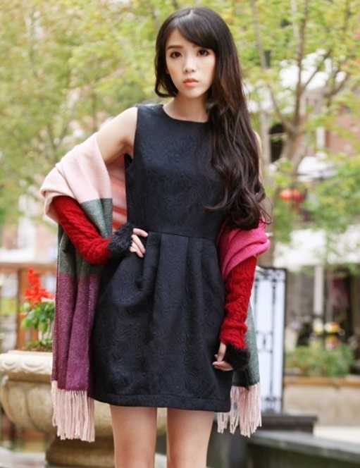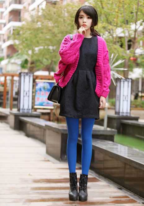 百搭款的刺绣冬季套头连衣裙,外搭亮丽的玫红色针织衫,衬托出白皙好肤色,搭配帅酷的黑色短袖,是一身很协调的时尚冬装。