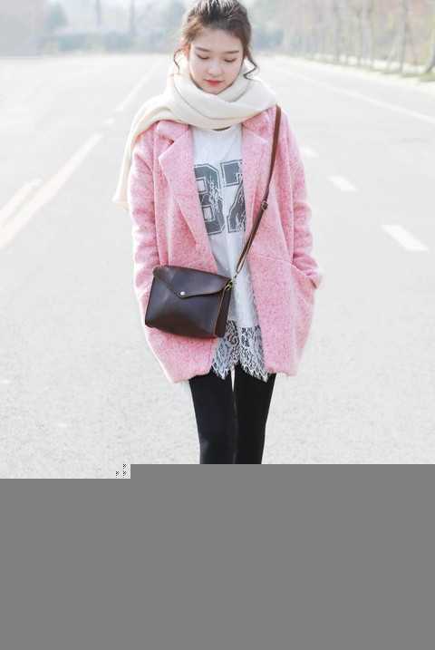 侧面看嫩粉色大翻领毛呢外套,有款有型,随意搭配纯色打底衫或裤子就很好看时尚了。