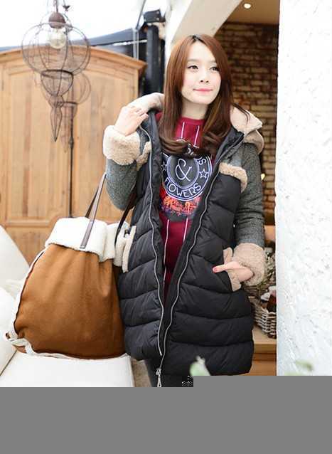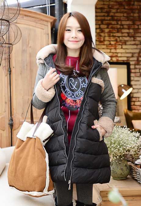 时尚撞色拼接款羽绒棉衣,百搭经典的黑色,轻松穿出显瘦时尚冬装 ,内搭复古红卫衣,是2014年最流行的卫衣搭配外套法,搭配温暖时尚的过膝长靴,让你2014年这个春季穿出格外温暖时尚装扮。