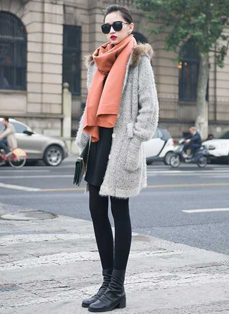 韩范十足的长款针织衫,混搭亮眼橙色围巾 ,给人眼前一亮的时尚感,搭配百搭黑色短裙和黑色短靴,穿出超大气场的国际范儿,冬季时尚搭配长款针织衫,是高个子MM必备的时尚单品。