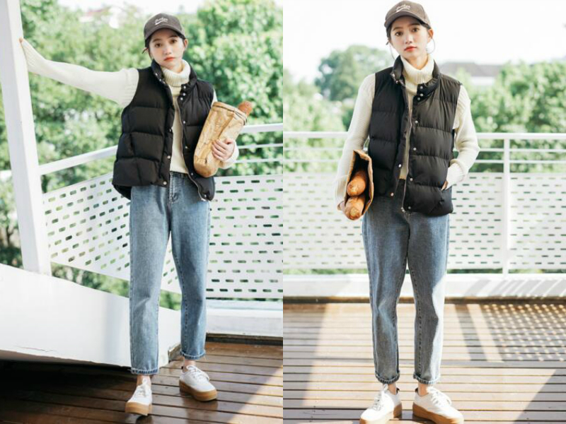 女生的发型与装扮倒是挺搭配的,头发随意扎起并戴上一顶棒球帽,看起来充满运动风,在白色的高领毛衣外穿一件黑色的马甲外套,再配一条浅色系牛仔裤,怎么看都很休闲。