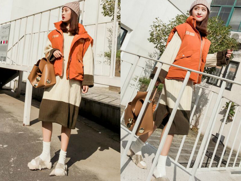 拼接色今年很流行,这套服饰装扮就是通过这点来彰显独特的。宽松的毛衣裙长至膝盖,保暖的同时也能修饰身形,拼接色的设计使其不单调,搭配一件鲜橙色的马甲看起来大方随性,在冬日的街头上成功吸引别人的注意力。
