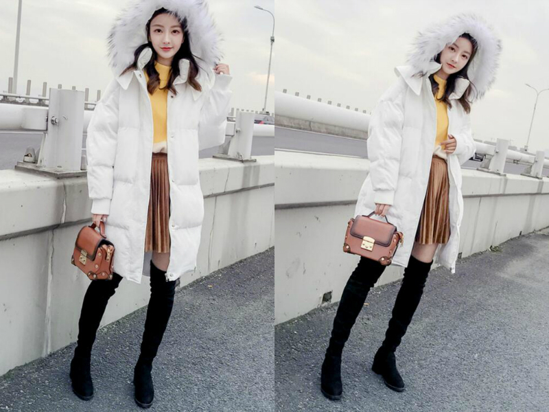 白色的长款羽绒服貌似颇受欢迎,在街上随处可见,超大的帽子设计把妹子整个头包裹住,内搭一件黄色毛衣加一条咖啡色百褶短裙,外套的长度刚好与裙子重合,下面穿一双黑色的长筒靴,纤细的小腿立刻显现,这样的搭配既不担心冷到又很时尚,你不打算时尚吗?