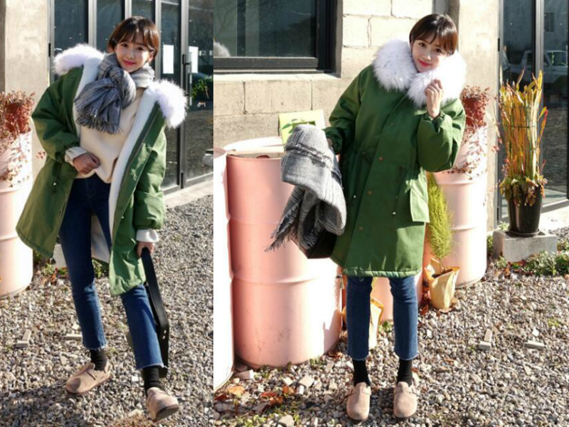 牛仔裤总是带给人青春的气息,妹子穿的这条深蓝色牛仔裤版型简约但很时髦,加上妹子的双腿本就纤细,穿上后倍显细直。上身搭配一件奶白色的打底衫外套一件绿色的中长款棉服,充满清新感,棉服上白色的大绒毛围在脖子周围,更衬托得妹子脸蛋精巧。