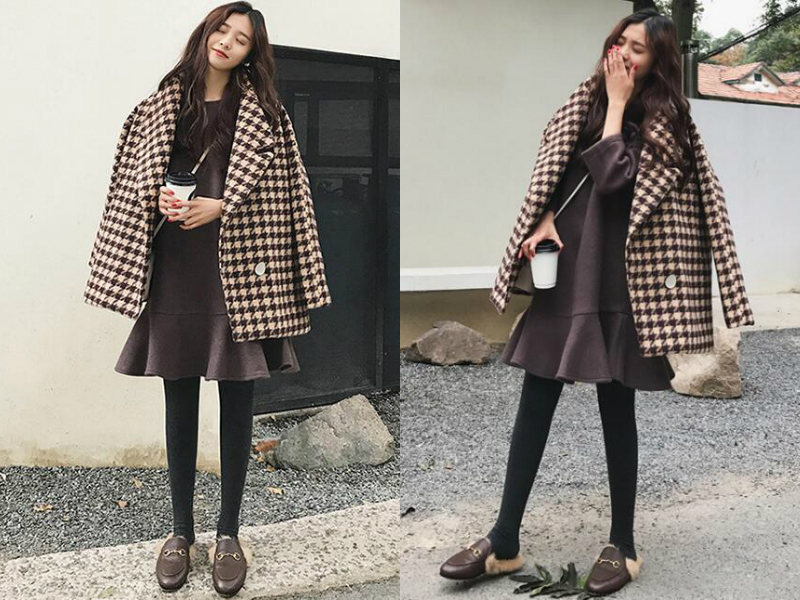这套服饰搭配从颜色来看有点暗沉,但与妹子的气质倒是很融合,加上妹子长相甜美,整体看上去很舒服也不显老。深紫色的连衣裙作为内衬,版型宽松显休闲,下摆荷叶边设计增添甜美感,里面再穿一条黑色打底裤,保暖又修腿型,外搭一件千鸟格纹外套,粉棕色交接经典耐看。