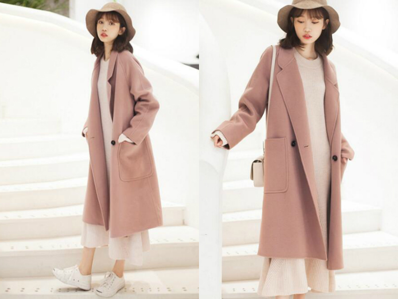 同是一套长款的服饰搭配,由于颜色较粉嫩,所以给人小清新的恬静感。外面穿的是一件皮粉色的长款呢子外套,款式简约大方,里面搭配一件粉白色的打底连衣裙,款式虽普通却很休闲,下摆重叠形成层次感,美观时尚。