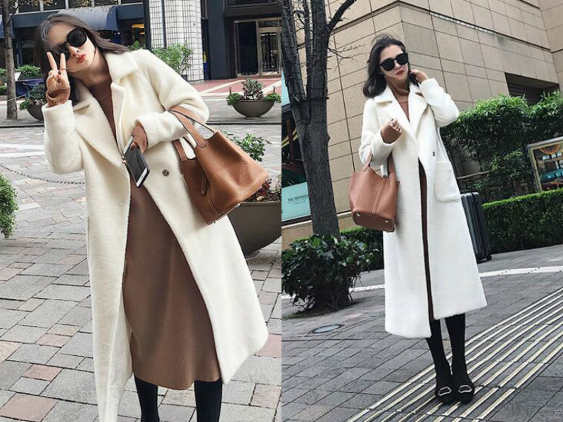 长款的服饰搭配得好既可以显瘦又可以显高,就像这款的效果一样。以一件浅巧克力色的长款连衣裙作为内搭,修身又简约,外穿一件白色的长款呢子大衣,下摆长至小腿,整体身形被拉长,脚上再穿一双黑色高跟鞋,视觉效果上身高更增高了!