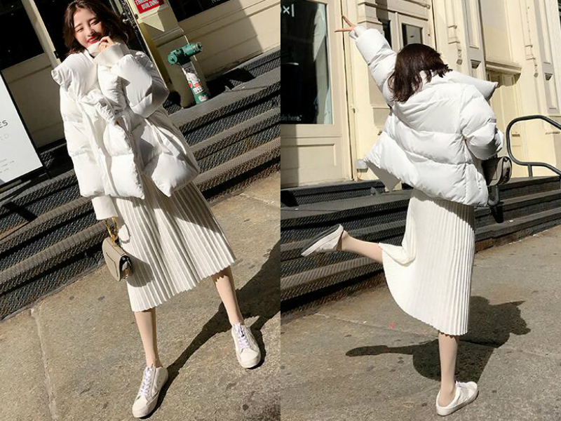 冬天白皑皑一片,这时再来一套全白的服饰,岂不是很应景么?妹子内穿一件长款的白色百褶连衣裙,显得清纯干净,外面穿上一件白色短款羽绒服,保暖防寒又修饰身形,脚上再穿一双小白鞋,整体装扮就更和谐养眼了!