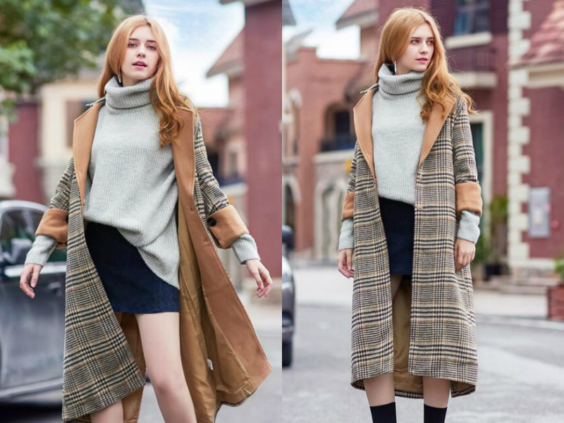 以一件高领毛衣作为内衬,宽松的款式彰显休闲风,下面搭配一条深蓝色半身短裙,修身显瘦。外套则穿一件经典的黄色撞色格纹大衣,H版型修身且垂顺,西装领的设计倍显帅气范,搭配一头金发,更显时髦大气。