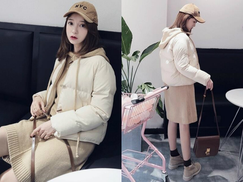 叠穿法一直都比较流行,妹子的这套搭配就是个很好的示范。以一件长款的连帽卫衣作为里层,针织面料柔软亲肤,连帽设计休闲百搭,裙摆长至膝盖,显瘦修身;外层则穿一件短款羽绒服,使身材比例呈现更完美,加上从头至脚都是同色系,看着很舒服。
