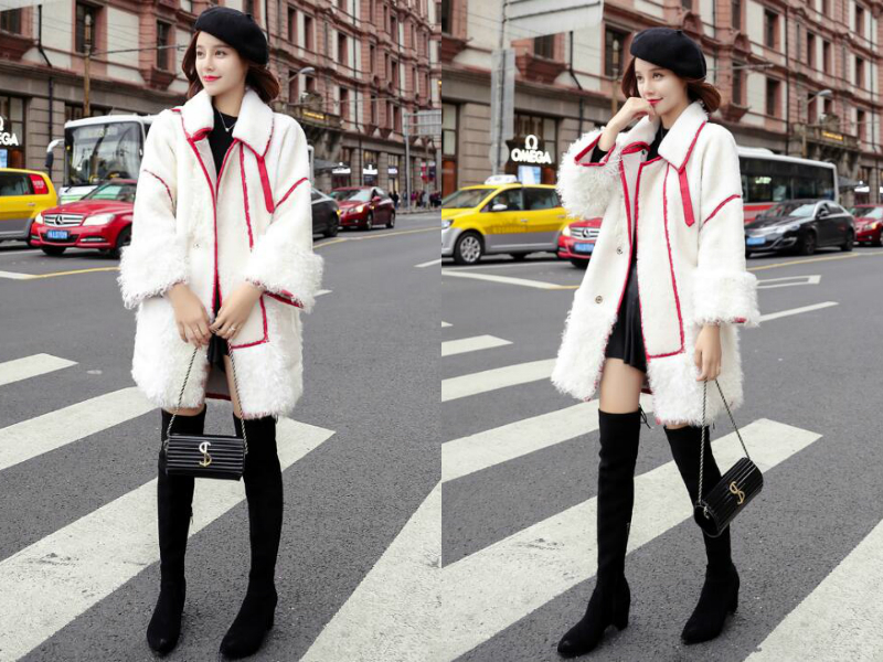 这款中长款的毛呢大衣,版型好立体剪裁自然贴身,白色羊羔毛显高贵大方,精致的翻领,卷袖的袖口,白色和红色的拼接撞色,设计感很足,上搭黑色毛衣,下搭黑色短裙,再穿上黑色长靴子,戴上贝雷帽,优雅淑女既视感。