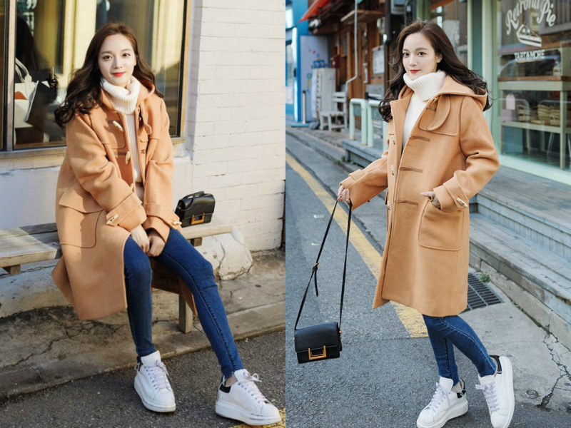 这款毛呢大衣很有日系学院风,非常减龄显嫩,带帽的设计,时尚的牛角扣,简约的口袋,绑带的袖口,彰显时尚感,百搭的驼色散发出清爽大气,上搭白色的高领毛衣,下搭蓝色牛仔裤,个性鲜明很有范儿。