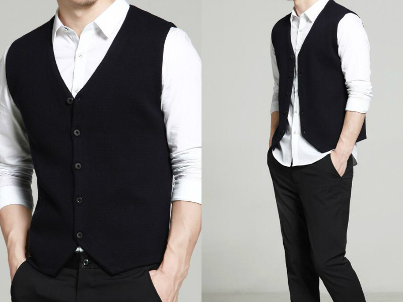 休闲的V领马甲修身大气,搭配经典的纽扣设计,展示了都市男人的成熟魅力,不管是商务还是休闲娱乐这样穿搭都很适合,搭配白色衬衫,更是有绅士的风格。