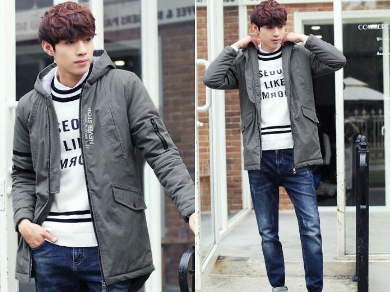 牛仔裤充满青春潮流感,总是让人忍不住回忆校园里的青葱岁月。男生的这套搭配看似很普通,却很有起独特的魅力所在,内搭的是一件假两件的针织衫,白色的衣服上印有黑色的英文字母,显得很特别,外搭一件连帽的棉外套,再搭一条紧身牛仔裤,看起来休闲又有范,加上男生俊朗的外形,想必很受女生欢迎哦!