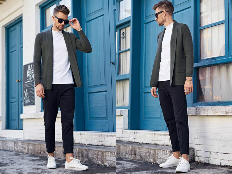 经典的黑白配,内穿一件纯白色的打底衫,下面搭配一条黑色紧身小脚裤,简约耐看,再外搭一件深灰色开襟针织衫,贴身的版型完美展现男生的肩膀轮廓,让男生显得挺立有型,加上墨镜的装饰,无形中又增添了一丝霸气感!