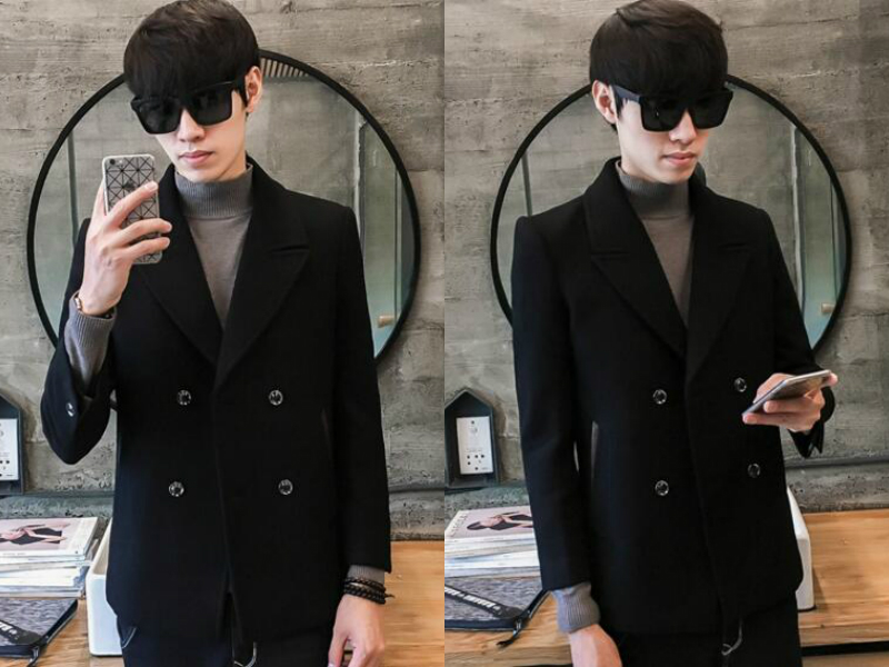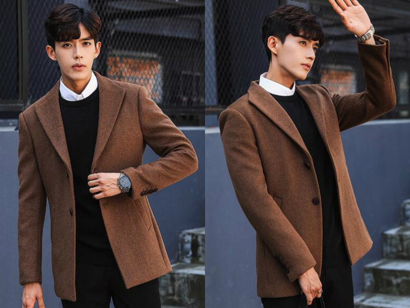 这件棕色的短款大衣款式简单大方,版型略修身,内搭一件白色衬衫和一件黑色针织衫,露出的洁白的衬衫领子在周围都是暗色系的情况下显得尤为突出,下装随意搭配一条黑色西裤,时尚中带着商务型男气质。