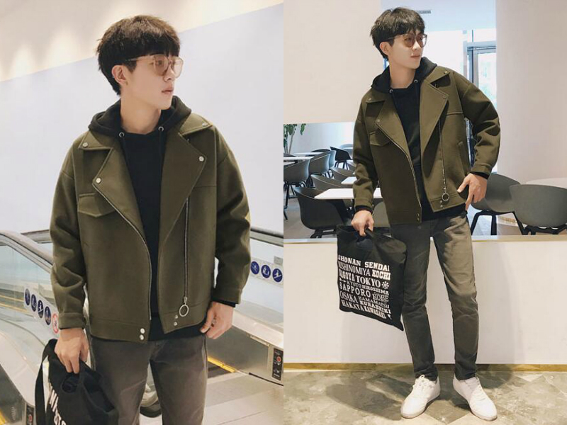 把一件黑色的连帽卫衣穿在里面作为内搭,展现出时尚运动风,外搭一件军绿色短款大衣,修饰身形更给人一种时髦的混搭feel,下装选择的是一条紧身休闲裤,彰显出男生的大长腿,脚穿小白鞋,流行又百搭。