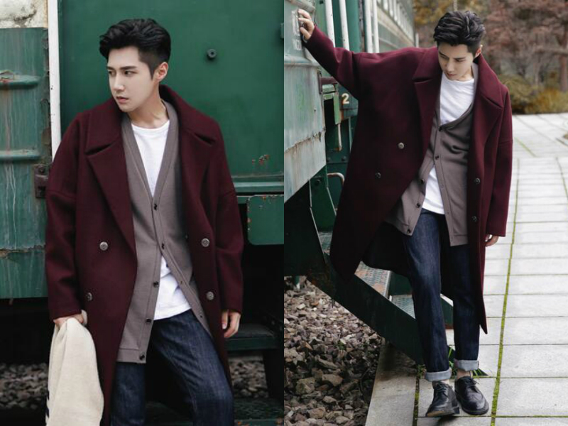 以一件白色T恤作为打底,然后穿上一件褐色的针织开衫,扣子随意的系了两个,展现出男士那种洒脱的气质,再在外面穿一件深酒红色的长款大衣,又增添高贵气息,但下装却搭配一条休闲范的牛仔裤,几种风格碰撞在一起倒也显得和谐,可以说混搭得很成功了,说不定还是另一种潮流的开始呢!
