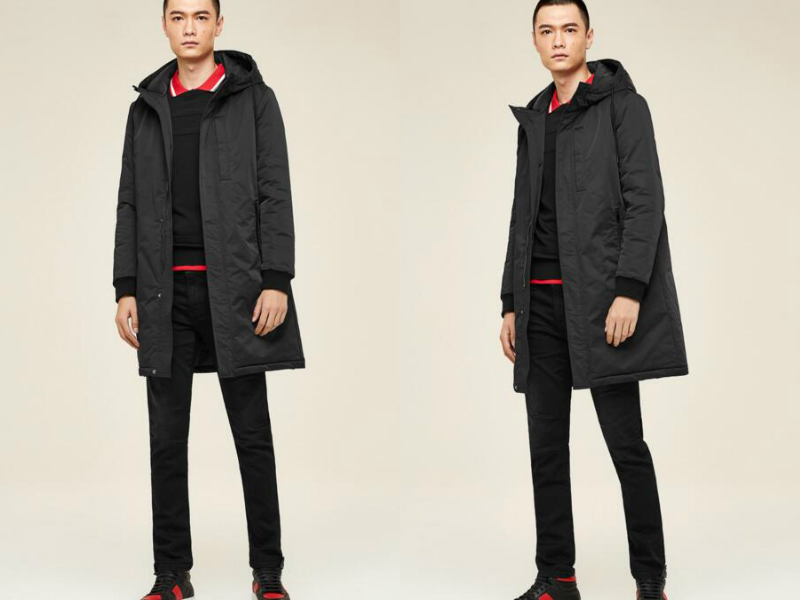 一身黑的搭配不知道有没有男生喜欢呢?以一件黑色的polo衫作为打底,红色的领子在一身黑的衬托下显得亮丽吸睛,外套一件H版型的长款棉服,连帽设计很休闲,下身穿一条黑色直筒长裤,大长腿立显。