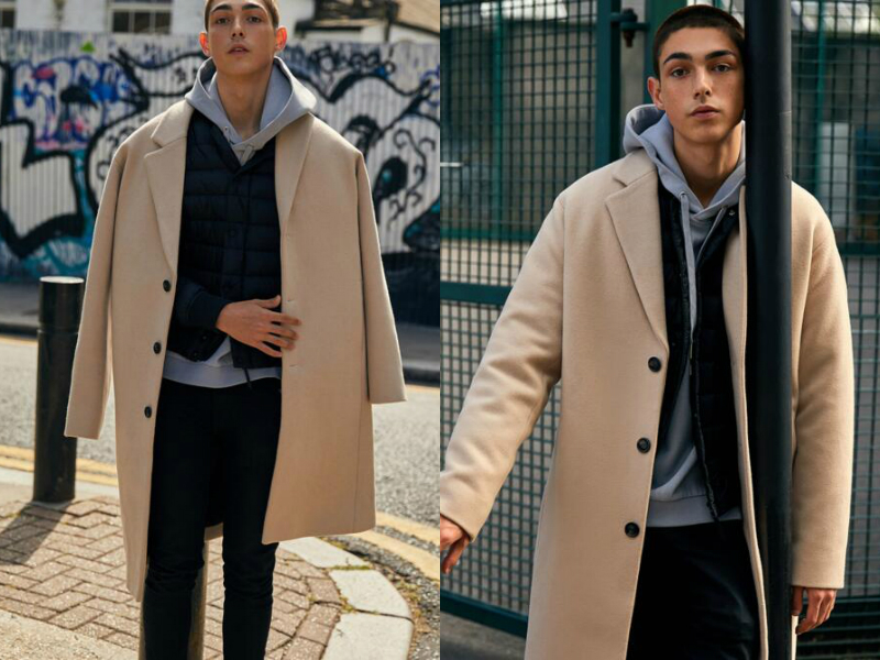 叠穿法很新颖,喜欢的男生不妨试试哦!最里层穿的是一件灰色的连帽卫衣,中间层则穿一件黑色的薄款棉服,最后再外面穿上一件驼色的长款呢子大衣,三种颜色之间层次感很强,混合在一起不会不和谐反而给人帅气时髦的感觉。