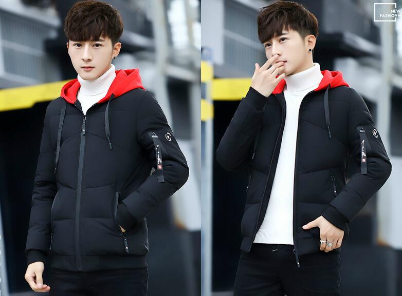 短款的韩版羽绒服,立体的剪裁,修身的版型,黑色特别显男生的帅气,红色的连帽和黑色撞色彰显潮流,内搭白色高领毛衣,很有吸睛的效果,纯白的颜色给男生增添了高雅的气质,非常有型。
