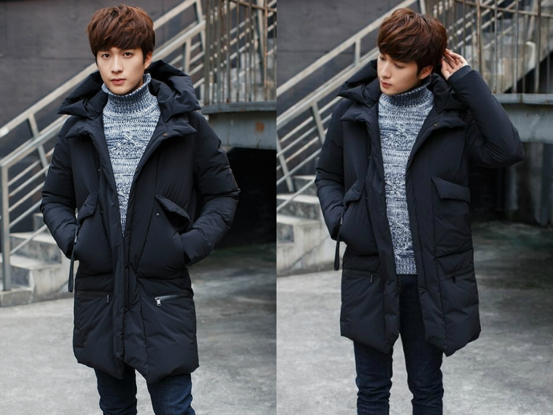 中长宽松版型的羽绒服,蓬松轻盈穿着舒适,很显男生高挑的身材,内搭一件紧身的高领毛衣,带着蓝色花点的时尚高领毛衣让男生看起来潮潮的,这样的穿搭真的很显男生魅力。