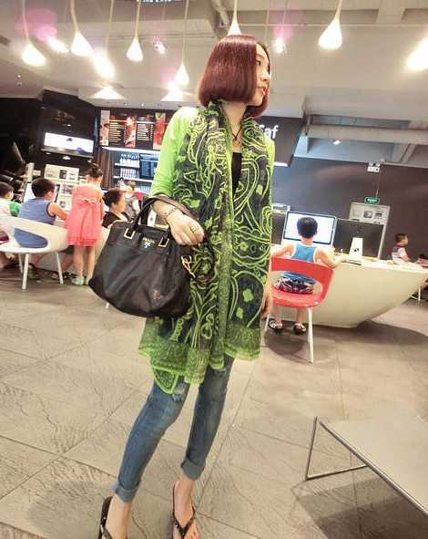 不规则的印花设计,精致细腻的棉麻围巾,搭配荧光绿的外套,正好跟围巾搭配同色系相呼应,碰撞出很清新抢眼的火花,搭配出清爽型小女人味道,让你完美蜕变一步到位。