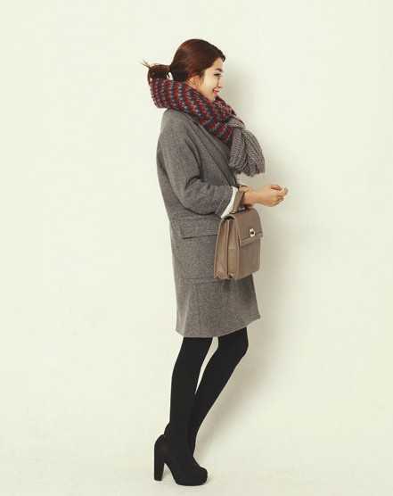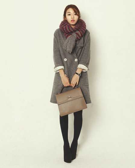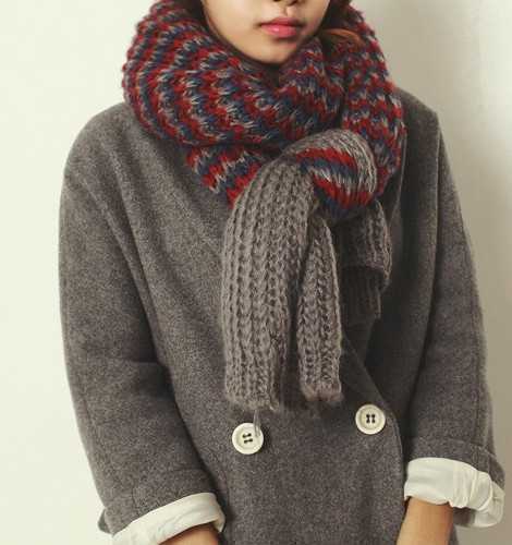 红灰的拼色毛线围巾,搭配灰色毛呢大衣,微卷袖口露出白色的内里,点缀出时尚的格调,轻易打造森女范气质,保守简单的搭配手法你学会了吗?