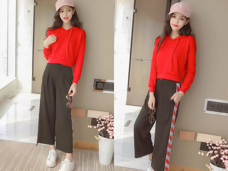 粉色的棒球帽为妹子增添甜美气息,加上帽子下一头蓬松卷曲的长发更是满满的美少女既视感,搭配一件鲜红色的卫衣和一条宽松的阔腿裤,倍显休闲运动feel。