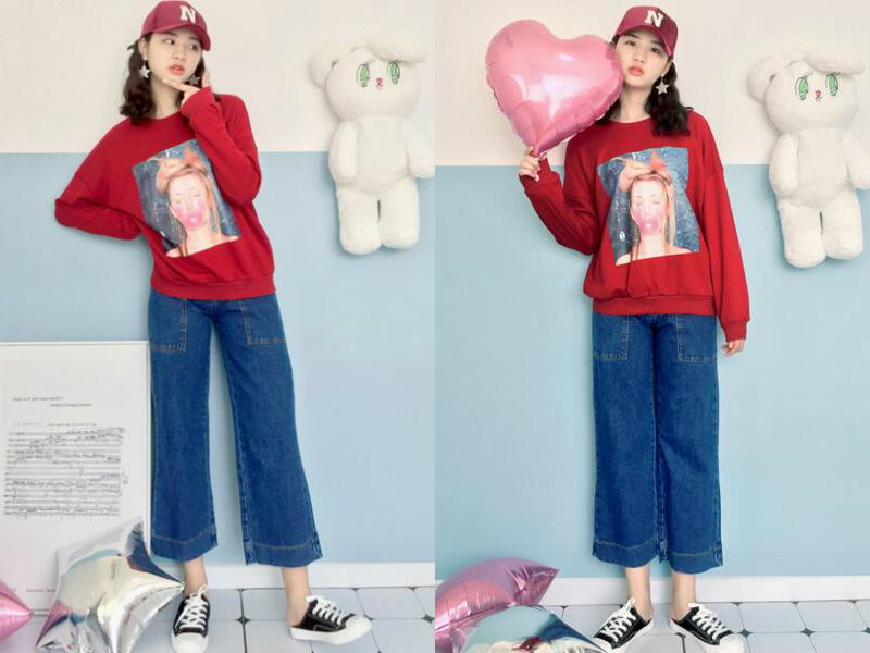 牛仔裤本就属于休闲类的服饰,这样一条宽松的深蓝色直筒牛仔裤上搭一件红色印花T恤,青春气息浓烈,再搭配一顶红色系的棒球帽,帽子上字母N的设计时尚新潮,如此休闲帅气的搭配在冬天里肯定很吸睛。