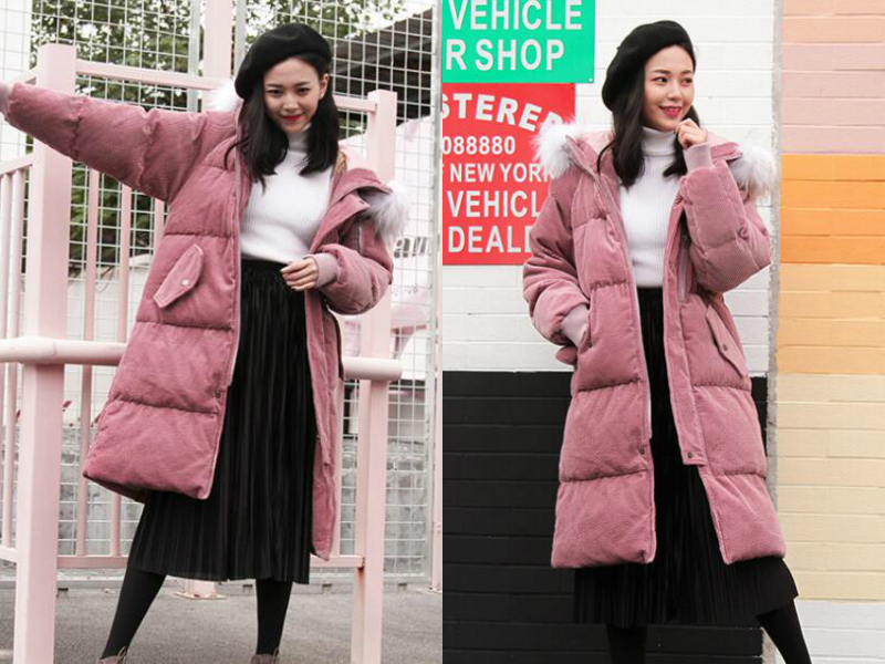贝雷帽在冬天非常受妹子们欢迎,也是日常凹造型的百搭之选。妹子身穿一件白色高领毛衣,简约温暖,搭配一条黑色高腰百褶裙,修身显瘦,外穿一件玫粉色长款棉服,身形更显修长。头上与之搭配的是一定黑色蓓蕾帽,款式经典大方,斜戴的方式衬托得妹子脸型小巧,更为妹子增添淑女气息。