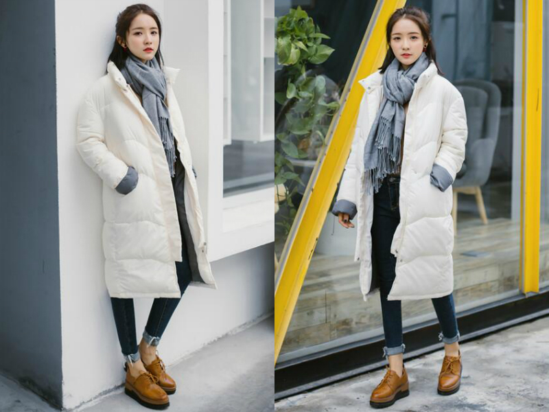 穿长款羽绒服也很好搭配围巾,灰色的围巾被以戴红领巾的方式戴在脖子上,简洁而保暖,更突出妹子尖细的下巴,外套一件长款的白色羽绒服,整个身形立显笔直修长,白色与灰色的搭配经典耐看,展露出妹子大方得体的一面。